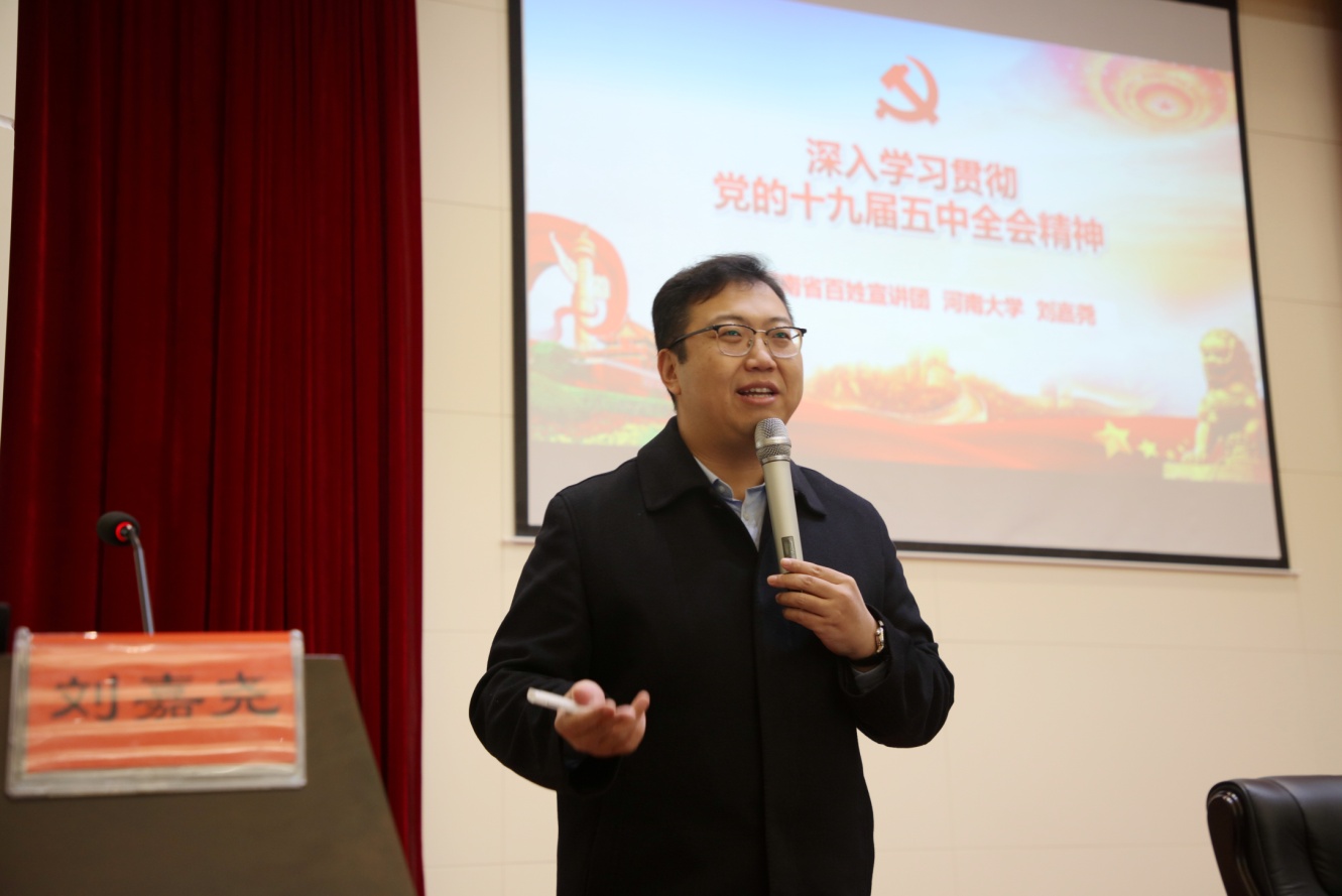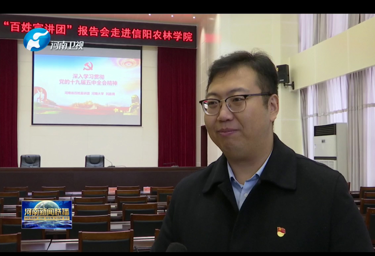 党的十九届五中全会以来,威尼斯官网37000cm威尼斯深入学习贯彻全会精神,开展了形式多样的宣讲活动。学院教师刘嘉尧代表省委百姓宣讲团先后在信阳师范学院、信阳农林学院、37000cm威尼斯等高校为青年学子宣讲十九届五中全会精神。河南电视台新闻联播分别于11月30日、12月1日进行了报道。12月7日,中央电视台新闻联播也对宣讲活动进行了播报。