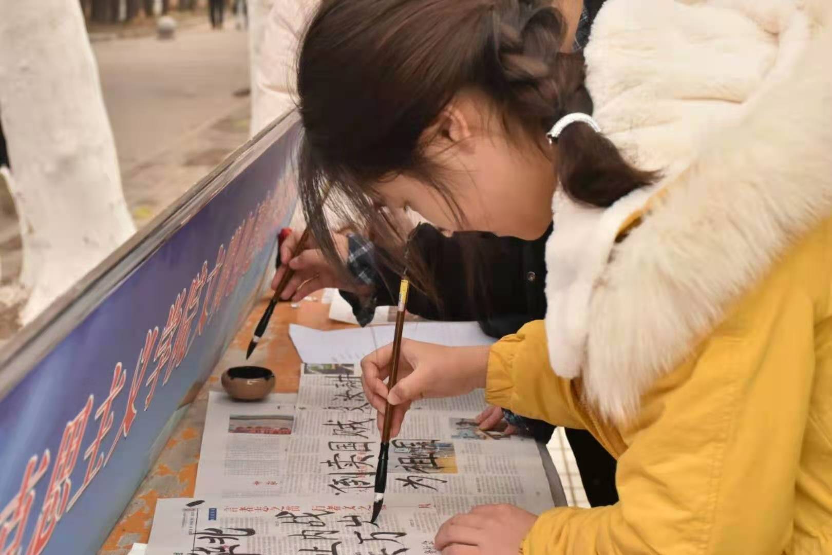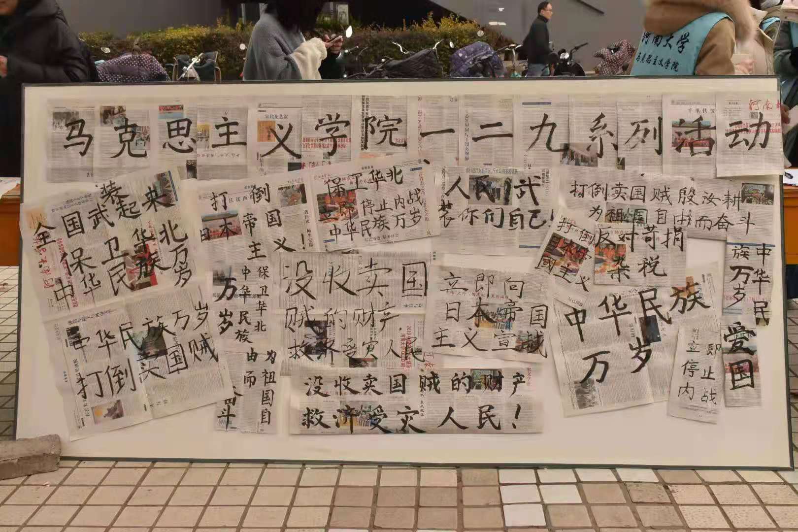 趣味游戏主要由知识竞答、红色小表演、书法展示三个活动组成。知识竞答环节中,面对志愿者的“一二•九”相关知识的提问,参与者们积极作答,充分表现青年学生对于历史的了解;红色小表演环节中,参与者不仅都能准确流畅地叙述红旗渠精神、汶川精神、长征精神和西柏坡精神等,同时还能够演唱《强军战歌》、《送你一枚小弹壳》等歌曲。学生声音嘹亮,歌词铿锵有力,活跃的互动使得现场氛围活跃,掌声不断,也吸引了更多同学参与。书法展示环节尤其受到同学们的欢迎,参加的同学将旧报纸平铺在桌上,抬腕、提笔、蘸墨,一笔一划地认真书写“一二·九”运动口号。参与者完成作品后,志愿者细心地将作品粘贴到空白展板上进行展示。同学们纷纷表示通过参与这次活动不仅体会到了书写书法的快乐,而且也深切感受到了当年参与“一二·九”运动的学生们的高涨的爱国热情和强烈的责任感。